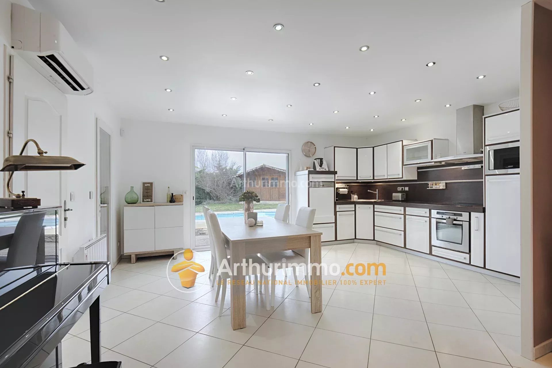 Vous profiterez d'un vaste séjour climatisé, idéal pour partager des moments conviviaux en famille ou entre amis, ainsi que d'une cuisine ouverte et toute équipée.